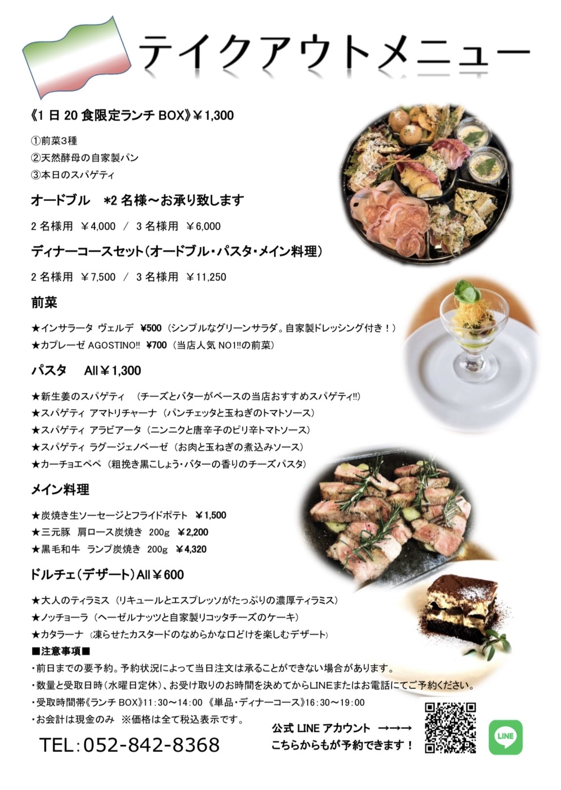 テイクアウトについてはすべて前日18時までのお電話かLINE公式アカウントからのご予約のみとさせていただいておりますのでご了承ください。